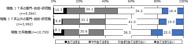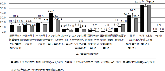 自己啓発を行った割合は、「現職がIT系の専門・技術・研究職」で46.3%、「IT系以外の専門・技術・研究職」で37.6%、「文系職種」で34.6%であった。