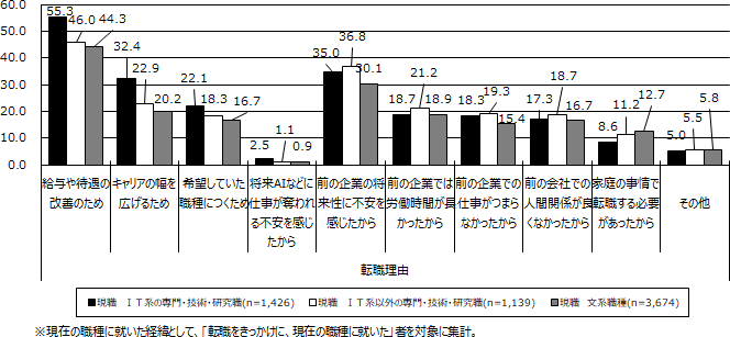 現在の勤め先への転職理由を尋ねたところ、「給与や待遇の改善のため」が最も多く、特に現職がIT系の専門・技術・研究職では5割を超えており、より高い給与や待遇を求めて転職を考え、実際に転職していることがわかる。