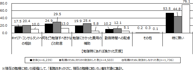 転職者に転職に必要な勉強を行う際にあれば良かった支援を尋ねたところ、勉強を行った転職者の44.8%が「特に無い」と回答。