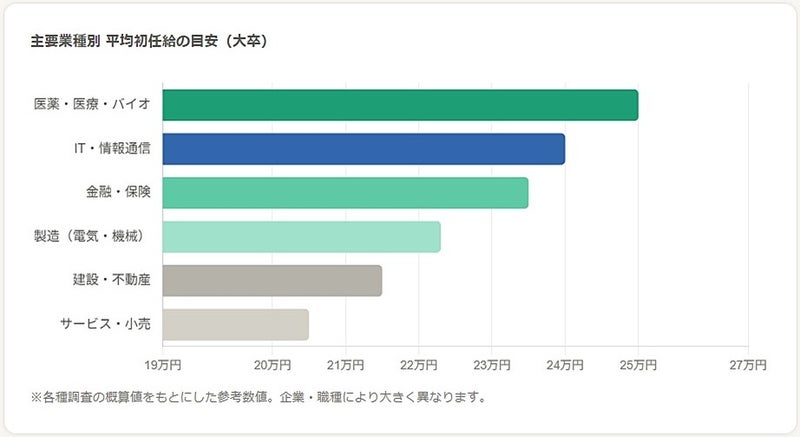 私が特に注目している製薬業界について、詳しく見ていきましょう。製薬業界の初任給は学歴によって大きく異なりますが、全体として全業種平均を上回る水準です。