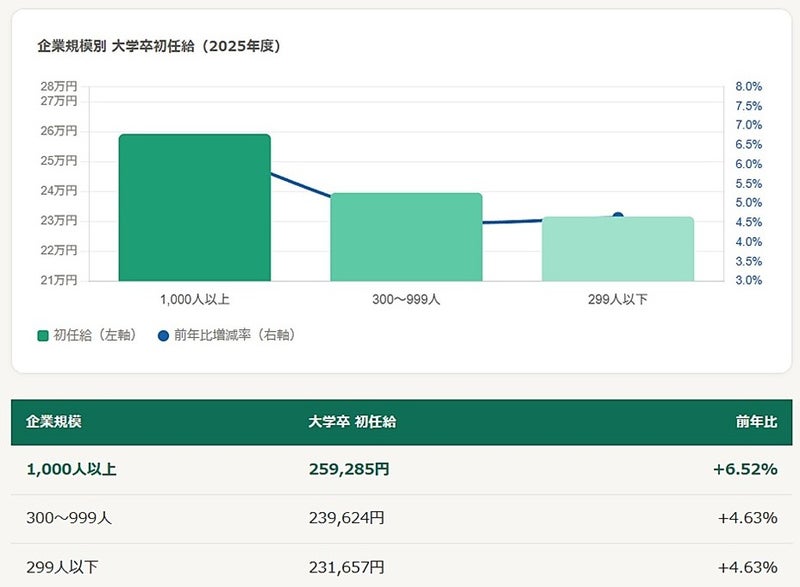企業規模別に見ると、大企業(1,000人以上)が最も高く前年比6.5%増と突出しています。採用競争の最前線にいる大手の積極姿勢がはっきり見て取れます。中小企業(299人以下)でも4.6%増と全体底上げが進んでいます。