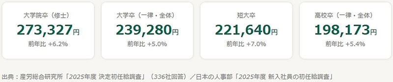 出典:産労総合研究所「2025年度 決定初任給調査」(336社回答)/日本の人事部「2025年度 新入社員の初任給調査」